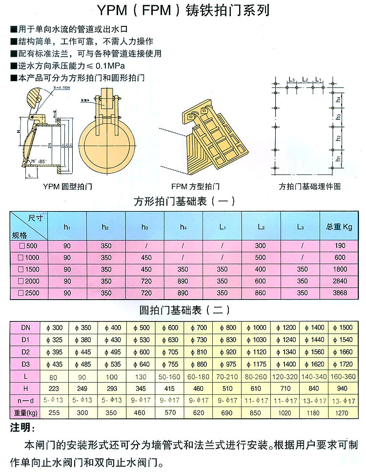 拍門規格分圓形拍門和方形拍門兩種,可根據出水口大小形狀設計生產;拍門類別可分別為空心浮板式拍門和平板式拍門。