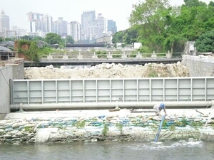 在水利水電建設中,隨著城市用水、景觀建設及環境整治和灌溉、發電的需要,翻板閘,水閘和橡膠壩得到廣泛的運用。然而,橡膠壩等生產比較復雜,運行時充水(充氣)升壩或放水(放氣)塌壩時間較長,影響快速截流或泄洪,再加上橡膠易老化的弊端,容易發生質量事故。現在市場上出現大量鋼結構閘門,或翻板閘但無論是提升式或臥倒式,單孔都很難適用較寬的河道。鋼壩閘是一種新型可調空控溢流閘門,它有土建結構、帶固定軸的鋼閘門門體、啟閉設備等組成。這種建筑物適合于閘孔較寬(10米~~100米)而水位差比較小的工況(1~~7米),由于它可以設計的比較寬,可以省區數孔閘墩,所以不僅結構簡單,可以節省不少土建投資,而且可以立門蓄水,臥門行洪排澇,適當開啟調節水位,還可以利用閘門門頂過水,形成人工瀑布的景觀效果。